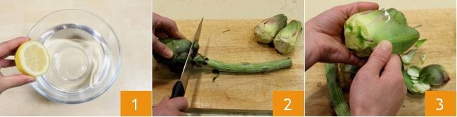 To prepare the lemon herb salmon, start with the artichokes that will accompany the salmon (if you prefer, you can use gloves while cleaning the artichokes to avoid staining your fingers): in a large bowl, pour cold water and squeeze the juice of a lemon 1; the water will prevent the artichokes from turning black as you cut them. Then, with a knife, remove the entire stem of the artichokes 2, then peel off the outer leaves 5 by hand until you reach the more tender and white ones.