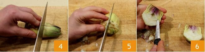 Once you've removed the outer leaves, cut off the tips of the artichoke 4 and then divide it in half 5. Then, with a small knife, remove the inner choke of the artichoke 6.