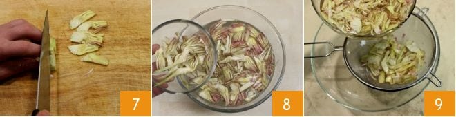 Cut the artichokes into thin slices 7, then gradually add them to the bowl with water and lemon 8. Once you have finished with the artichokes, drain them 8.