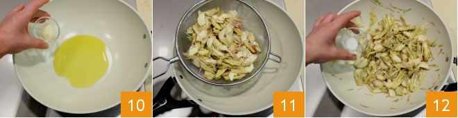 Then, in a large pan, pour a drizzle of oil and the peeled garlic clove 10. Next, add the drained artichokes 11, stir, and add a pinch of salt 12.