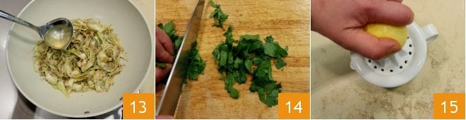Also pour in the Vegetable broth 13 to aid cooking and cook the artichokes over high heat for about 10 minutes, adding more ladles of vegetable broth as needed. While the artichokes cook, chop the parsley 14. Then squeeze the juice of a lemon 15.