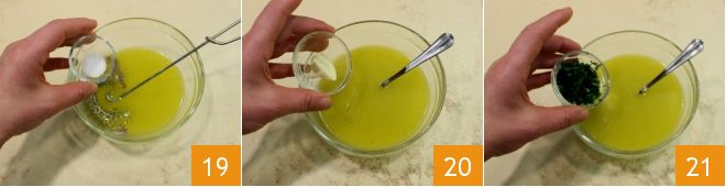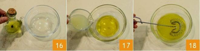 Then, in a small bowl, pour 3/8 cup of oil 16, the juice of the squeezed lemon 17, and mix to emulsify the two liquids 18.