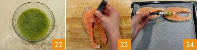 Mix again to blend the ingredients 22. Then take the fresh Norwegian salmon, remove the most visible bones with the help of tweezers 23, and place them on a baking sheet lined with parchment paper. Brush each fillet with the oil and lemon emulsion 24. You can also keep some emulsion aside to add at the end of cooking.
