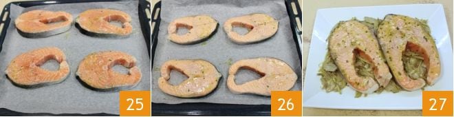 Once you have finished coating the fillets with the emulsion 25, bake them at 430°F for about 8-10 minutes: the salmon should not be cooked too much to keep its flesh tender and flavorful. Halfway through cooking, turn the fillets over to the other side 26, then take them out of the oven, and serve, adding the bed of artichokes and more emulsion 27.