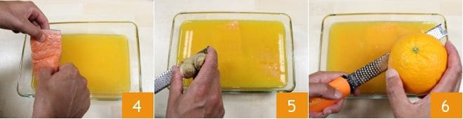 Immerse the deboned salmon fillets in the juice inside the baking dish 4, grate a pinch of peeled fresh ginger 5, and add the zest of 2 oranges 6.