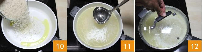 In a non-stick pan, put a tablespoon of oil, add the rice 10, and toast it for a couple of minutes while stirring. When the water in the pot reaches boiling, turn off the heat and pour the boiling water into the saucepan where you toasted the rice, the water should cover the rice by at least an inch 11. At this point, cover the pan with a lid 12 and cook on low heat for about 10-12 minutes, then turn off the heat and let it rest. To learn how to best prepare pilaf rice, consult the complete recipe: Pilaf Rice.