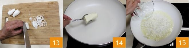 Now clean and trim the fresh spring onions, slice them thinly 13, and heat the butter in a non-stick pan over low heat 14. Once the butter is melted, transfer the sliced onions into the pan 15 and cook over moderate heat for 5-6 minutes.