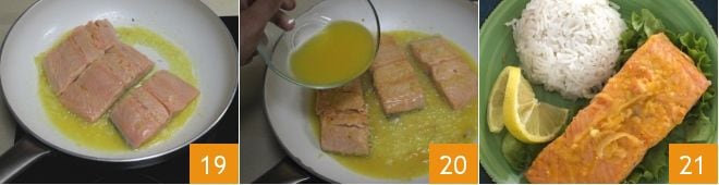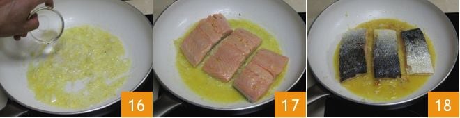 Then add acacia honey 16 and, after the salmon fillets have marinated, transfer them to the pan, keeping the marinade juice aside, and place them with the skin side down in the pan 17. Cook for 5 minutes over moderate heat, then turn them over to the flesh side and cook for 2 minutes 18.