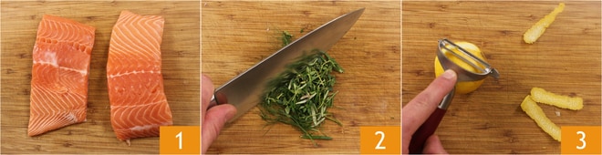 To prepare the steamed salmon, start by removing the skin and bones 1, or ask your fishmonger to prepare 2 equal fillets without bones and skin. Finely chop the herbs together 2, keeping only the bay leaves and a sprig of rosemary aside. Peel the lemon with a peeler, set aside the zest slices 3 and squeeze the juice.