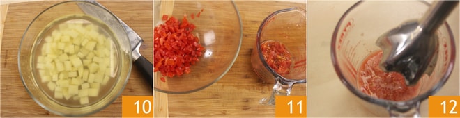 Peel and cut the potato, then place it in a bowl with water to prevent it from browning 10. Finally, cut the cherry tomatoes into quarters, remove the pulp and seeds which you will blend with the help of an immersion blender, and cut the slices into cubes 11 12.