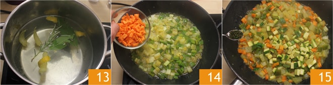 Put a large pot of water on the stove, on which you will place the steaming basket, and prepare flavored water with lemon zest, bay leaves, and a sprig of rosemary 13, then increase the heat and bring the water to 176°-194°F. Continue with the vegetables: heat 3 tablespoons of extra virgin olive oil in a pan and sauté the onion over medium-low heat. As soon as it starts to sizzle, add half a glass of water, lightly salt, and when the liquid has almost completely evaporated, add the potato cubes, celery, bell pepper, and carrots 14. Cook for 10 minutes over medium heat, slightly browning the potatoes. If the mixture dries out too much, add half a glass of water. Add the chopped zucchini and the remaining herbs 15, salt, pepper, and cook for another 10 minutes.