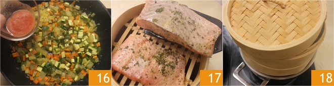 Finally, add the blended cherry tomato juice 16 and the cherry tomato cubes; cook for another 10 minutes ensuring all the vegetables are well cooked. Place the basket on the pot; remove the salmon fillets from the marinade and place them on the basket 17. Cook the fish inside the basket with the lid on for about 8-9 minutes (if the fillets are very thick, increase the cooking time), being careful to maintain a gentle boil throughout the cooking, otherwise, the fish pieces will flake too much 18. Plate the steamed salmon fillet with the vegetables around and serve.