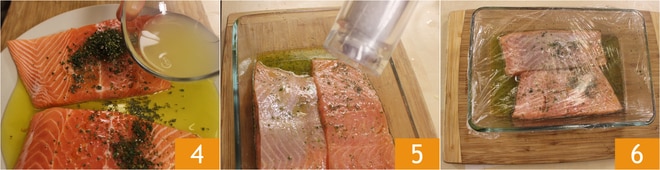 Marinate the salmon fillets for 10 minutes in 8 tablespoons of olive oil, half of the chopped herbs, and the lemon juice 4. During this time, turn the fish in the marinade several times, salt 5 and pepper, then cover it with plastic wrap 6 and let it rest in the refrigerator for another 10 minutes.