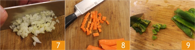 Meanwhile, finely chop the onion 7 and start cutting the vegetables into approximately equal cubes, about half an inch: peel and cut the carrot 8, the zucchini, and the celery, after removing the strings. Cut the green bell pepper into quarters, remove the seeds and white filaments, peel the outer skin and also cut it into cubes 9