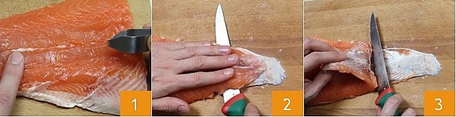 To prepare baked marinated salmon, start by cleaning the salmon fillet (if you bought a whole salmon, you will need to remove the entrails and fillet it). Using kitchen tweezers, remove the bones 1, then gently peel the skin off with a sharp knife starting from the tail (2-3) to separate the skin from the fillet.