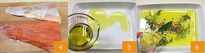 Once cleaned, you should obtain about 1.75 lbs of salmon fillet 4. At this point, you can prepare the marinade: pour the oil into a high-sided ceramic or glass baking dish 5. Add all the aromatics: lemon juice and grated zest 6,
