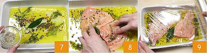 black pepper, pink pepper, salt, dill, thyme, bay leaf, anise seeds, and fennel seeds 7. Add the salmon fillets and gently massage them so that the marinade flavor penetrates the flesh. Cover the dish with plastic wrap and let the salmon marinate for 24 hours in the refrigerator.