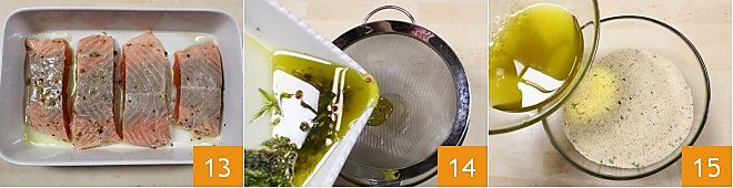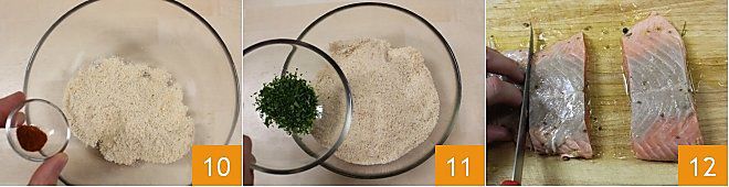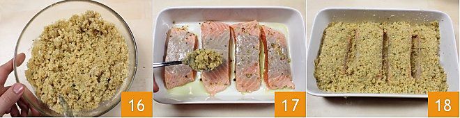 and mix well to moisten the breading 16. Cover the entire surface of the marinated salmon with the moistened breading (17-18). Cook the marinated salmon in a preheated static oven at 350°F for 10 minutes (or in a convection oven at 320°F for 6-7 minutes). After 10 minutes, change the oven mode from static to grill, increase the temperature to 445°F and grill the marinated salmon for another 5 minutes. When the breading is nicely golden, remove the baked marinated salmon from the oven and let it cool for a few minutes before serving.