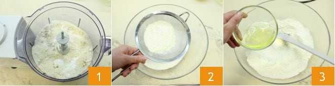 To make the salted caramel macarons, start by preparing the macaron shells: blend the almond flour with the powdered sugar 1 to create a finer mixture and then sift it with a large-mesh strainer 2, add 75 g egg whites 3