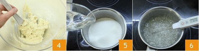 mix the mixture with a wooden spoon to bind the ingredients 4. Cover the mixture with plastic wrap and set aside at room temperature. Now, take care of the sugar syrup. Place a small pot on the stove, pour in the sugar and water 5, and bring the syrup to 250°F, using a candy thermometer to check the temperature. When the syrup reaches 241°F 6