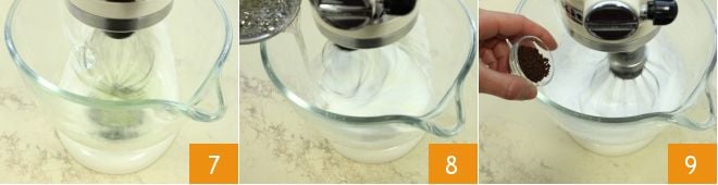 start whipping the other 75 g of egg whites with a stand mixer 7 or electric beaters, and when the syrup reaches 250°F, slowly pour it into the mixer with the egg whites 8 while continuing to whip; add the instant coffee powder 9 until the syrup has cooled and the meringue is glossy and frothy.