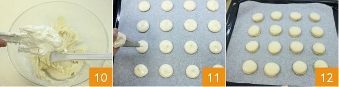 Incorporate the meringue into the almond flour mixture a little at a time 10, gently folding with a spatula to obtain a smooth and soft dough. Transfer the mixture into a piping bag with a plain nozzle, then prepare a baking sheet lined with parchment paper, greasing the tray to help the paper adhere better. Pipe small discs of mixture, well-spaced, about 1.5 inches in diameter 11. Let the mounds rest for at least 20 minutes on a baking sheet lined with parchment paper so they will slightly flatten on their own and become perfectly smooth on the surface. Bake the macarons in a preheated convection oven at 320°F for 10 minutes (static mode is not recommended), and once cooked, turn off the oven and leave the macarons for another two minutes with the door half-open to dry them (to help with this operation, you can wedge a spoon in the opening to keep the oven door ajar). Once dried, remove the macarons 12 and transfer them to a wire rack to cool.