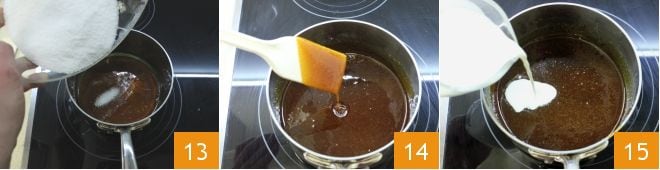 Now take care of the caramel: place a pot on the stove and gradually add the sugar 13, allowing it to melt and brown over low heat. Do not stir the sugar at this stage of preparation, but only swirl the pot. Meanwhile, heat the cream, and when the caramel is smooth 14, incorporate the hot cream 15.