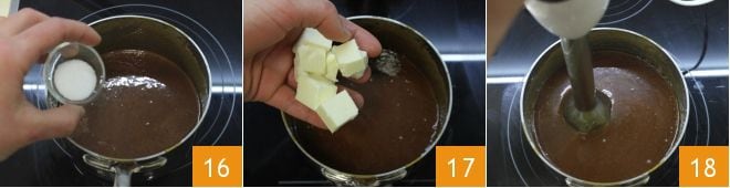 Mix the syrup with a whisk and add the salt 16 and the cold butter cut into small cubes 17. Continue mixing until you obtain a smooth and homogeneous mixture, then emulsify it with an immersion blender 18.