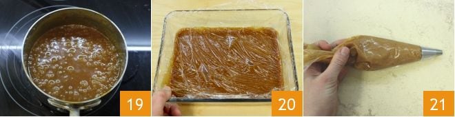 At this point, the syrup is ready 19, transfer it to a shallow, wide bowl, cover it with plastic wrap 20, and place it in the refrigerator to set. Assemble the macarons: transfer the caramel into a piping bag with a plain nozzle 21.