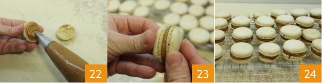Fill the macarons by piping a dollop of caramel onto the flat side of half of the discs 22, then close with another disc, applying light pressure 23. Your coffee and salted caramel macarons are ready to be enjoyed 24.
