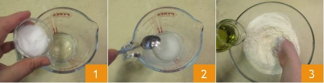 To make the sardenaira, first prepare the dough: take a small amount of water from the total dose, add the salt 1, and stir with a teaspoon to dissolve it 2. Place the flour in a large bowl and start kneading while slowly pouring in the oil 3.