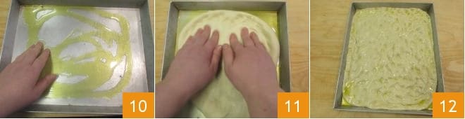 After 20 minutes, oil a 14x11 inch pan 10 and spread the dough with your fingers directly in the pan (11-12), then let it rise for an hour at a temperature of 77°F-79°F at room temperature covered with plastic wrap (away from drafts) or in an unheated oven with the light on.