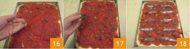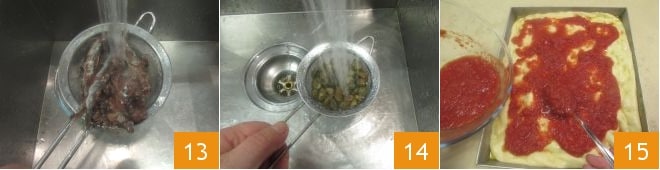 In the meantime, desalinate the anchovies 13 and capers by rinsing them well under running water 14, and drain the olives. Once the rising time is over, preheat the oven in static mode to 410°F and start topping the focaccia: gently spread the tomato pulp over the entire surface 15,