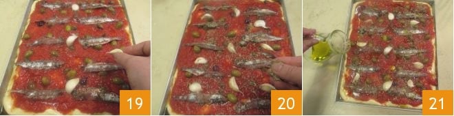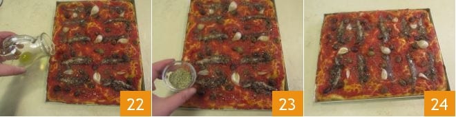 Bake the focaccia in a preheated static oven at 410°F for about 30 minutes. Once cooked, take the sardenaira out of the oven and dress it with the remaining 1 1/2 tablespoons of oil 22 and a bit more oregano 23. Your sardenaira is ready to be enjoyed nice and hot 24!