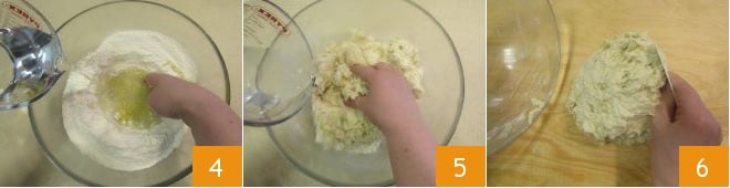 and the remaining water 4, then also add the water in which you dissolved the salt 5. Continue kneading to mix the ingredients, then transfer the mixture to the work surface 6 and work it with your hands until the dough is compact.