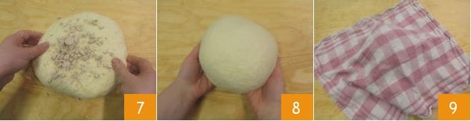 At this point, add the crumbled fresh yeast 7 and continue working the dough for about 10 minutes until it becomes smooth, soft, and homogeneous 8. Cover the dough with a kitchen towel 9 and let it rest at room temperature for 20 minutes.