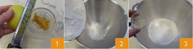 To prepare Zippulas or Sardinian zeppole, start with the dough: grate the zest of the untreated orange and lemon 1 and set it aside. In the bowl of a stand mixer (or in a glass bowl if mixing by hand), pour the sifted flour 2 and add the dry yeast 3.