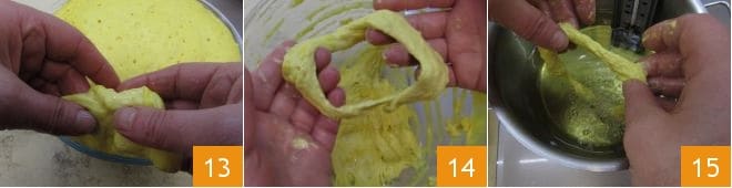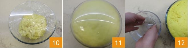 Cover the bowl with plastic wrap 10 and let it rise for about 3 hours or until the dough has doubled in size 11. The ideal place for rising is in the oven with just the light on. Once the rising time has elapsed, proceed with frying: heat the seed oil in a pan until it reaches 340°F (170°C); use a food thermometer to ensure optimal frying. To form the zeppole, proceed as follows: wet your hands with water 12