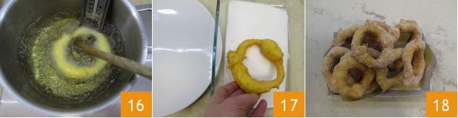 and using the wooden handle of a ladle, rotate the doughnut 16 so that it maintains its shape during cooking. When the zeppola is golden, remove it with a slotted spoon and place it on a tray lined with absorbent paper to dry the excess oil. Continue forming other zeppole until all the dough is used up. Finally, roll the zeppole in granulated sugar on both sides 17. Serve your Sardinian zeppole immediately! 18