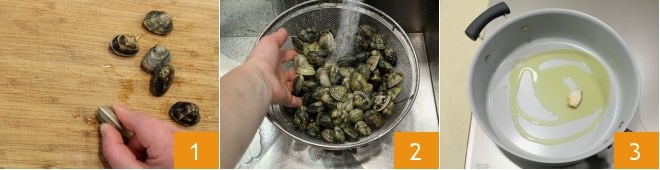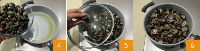 Then remove the garlic and add the drained clams to the pan 4, stir and cover with the lid 5; cook over high heat until the shells open. Once ready 6