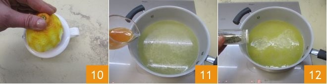 Squeeze the orange juice 10, strain it, and add it to the clam cooking liquid 11. Turn on low heat, season with ground pepper 12