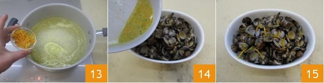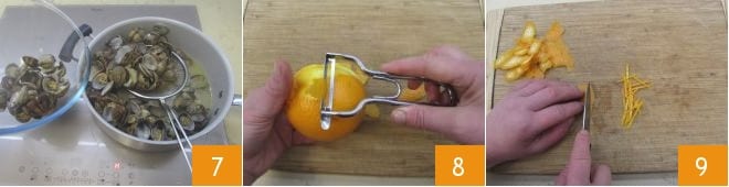 you can drain them with a slotted spoon 7, keeping the liquid that has formed in the pan; keep the clams warm and proceed by peeling the orange with a vegetable peeler to remove only the outer zest 8 without taking away the more bitter white part. Then cut the zest into julienne strips 9 and set aside.