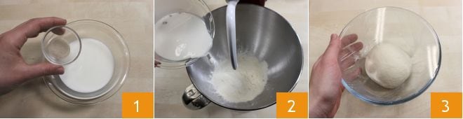 To prepare the savory baba, start with the starter: pour the lukewarm milk into a small bowl and add the dry brewer's yeast (or alternatively 12 g of fresh brewer's yeast) 1. Stir to dissolve it completely. In a stand mixer, pour the flour (Manitoba or all-purpose) previously sifted and add the milk in which you dissolved the brewer's yeast 2; knead with your hands in the bowl, then transfer the dough to a lightly floured surface to work it for a few moments: you should form a small ball, and the dough should be very soft and smooth. Place it in the bowl 3 and cover with plastic wrap; let it rise for about 2 hours in an off oven with the light on until it doubles in volume. In the meantime, you can prepare the filling and dice the salami, cooked ham, fontina, and provola. You can also chop the aromatic herbs and pit the Gaeta olives.