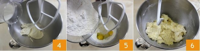After the 2 hours have passed, take the starter and place it in the bowl of a stand mixer; pour the fresh liquid cream gradually 4 and 4 whole eggs or beaten (you can beat them before adding them to the dough to weigh them more easily). Then add the sifted flour (Manitoba or all-purpose), a little at a time 5, as you run the stand mixer. Once the flour has been incorporated, you can attach the spiral hook 6.