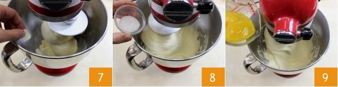 Then add the sugar and grated pecorino cheese to the dough. At this point, let the hook work: the dough should be kneaded until it wraps around the hook. Then you can add the softened butter in small pieces 7, incorporating one piece at a time and waiting for the previous one to be absorbed before adding the next one. Then also add the salt 8, then the other 4 eggs at room temperature, one at a time (or gradually if you have beaten them) 9, and continue working the dough to incorporate them.