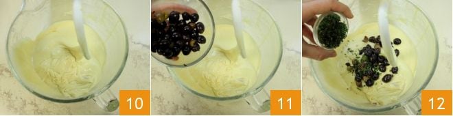 You should obtain a very soft and elastic dough 10. You can stop the stand mixer and add the filling: the Gaeta olives 11, the aromatic herbs 12,