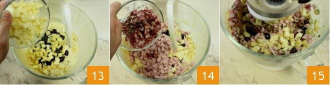 the diced cheeses 13, the cooked ham, and the salami 14. Turn on the stand mixer again to mix the ingredients homogeneously into the dough 15.