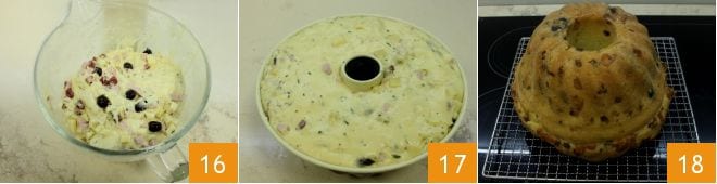 Now that the dough is ready 16, you can butter a savarin mold with a diameter of 22-24 cm (8.66-9.45 inches) and pour the mixture inside, letting it rise for another hour in an off oven with the light on 17. After the necessary time has passed, you can bake the savory baba in a static oven preheated to 356°F (180°C) for about an hour (if using a convection oven, at 320°F (160°C) for 50-55 minutes). Then take your savory baba out of the oven 18, and when it is cool, turn it out and remove it onto a wire rack. You can accompany the savory baba with a savory zabaglione cream, which you can find by clicking here: savory zabaglione.