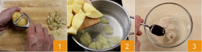 To prepare the savory braid, first peel the potatoes 1, cut them into pieces, and boil them 2 until they are cooked. Then drain and mash them. While the potatoes cook, dissolve the fresh yeast (or 4 g of dry yeast) and the malt (or sugar) in the lukewarm water 3.