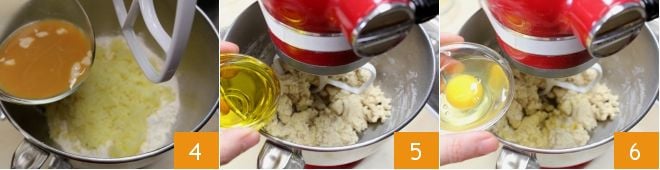 In the bowl of a stand mixer with a paddle attachment, pour in the flour, the mashed and cooled potatoes, and the water with malt and yeast 4. Then add the oil 5 and the egg 6 while keeping the mixer running.